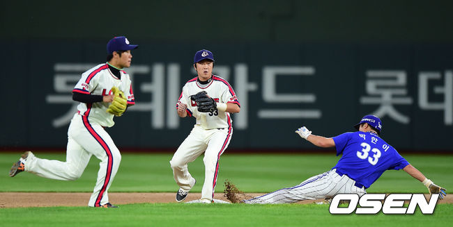 1회초 삼성 공격 무사 주자 1, 2루 상황 채태인의 내야 안타 때 타구를 잡은 롯데 유격수 신본기가 주자 박한이가 2루에 도착하자 1루로 공을 던지려 하고 있다. 타자 주자까지 모두 세이프되며 무사 만루.