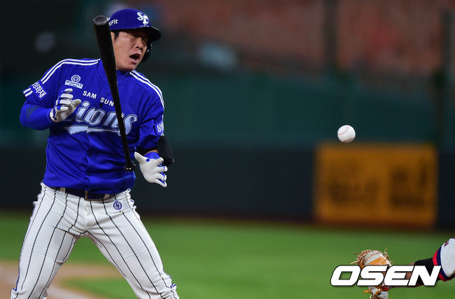 1회초 삼성 공격 1사 1, 2루 상황 조동찬이 롯데 선발 이상화의 투구에 몸을 맞으며 배트를 놓치고 있다.