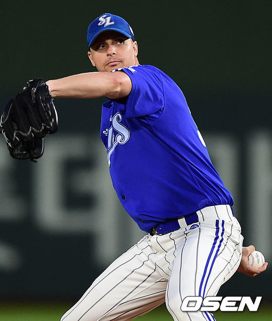 삼성 선발 마틴이 힘차게 공을 뿌리고 있다.