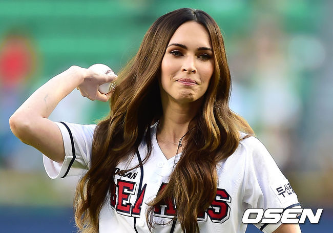 27일 오후 서울 잠실야구장에서 열린 '2014 한국야쿠르트 세븐 프로야구' 두산 베어스와 LG 트윈스의 경기에 앞서 할리우드 스타 메간 폭스가 시구를 하고 있다.