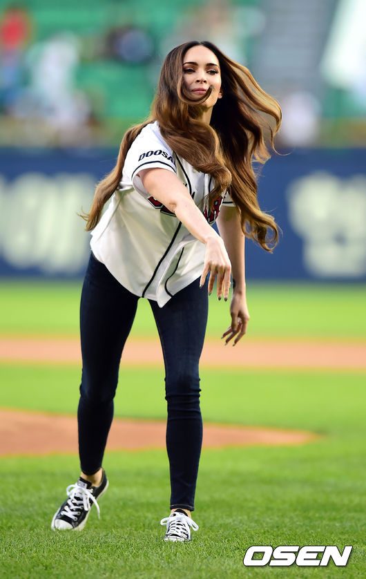 27일 오후 서울 잠실야구장에서 열린 '2014 한국야쿠르트 세븐 프로야구' 두산 베어스와 LG 트윈스의 경기에 앞서 할리우드 스타 메간 폭스가 시구를 하고 있다.