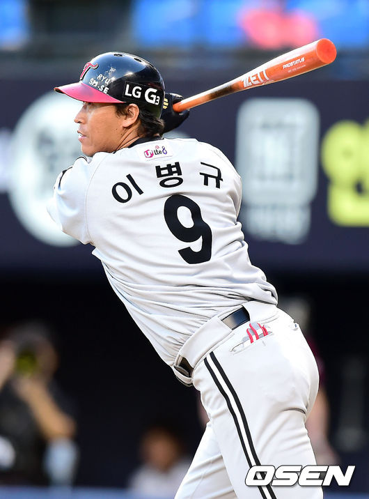 27일 오후 서울 잠실야구장에서 열린 '2014 한국야쿠르트 세븐 프로야구' 두산 베어스와 LG 트윈스의 경기, 1회초 2사 1,3루 LG 이병규가 적시타를 때리고 있다.