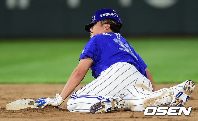 2회초 삼성 공격 2사 1루 상황 채태인 타석 때 도루를 시도한 주자 박한이가 롯데 유격수 신본기의 태그에 걸려 아웃된 뒤 아쉬워하고 있다.
