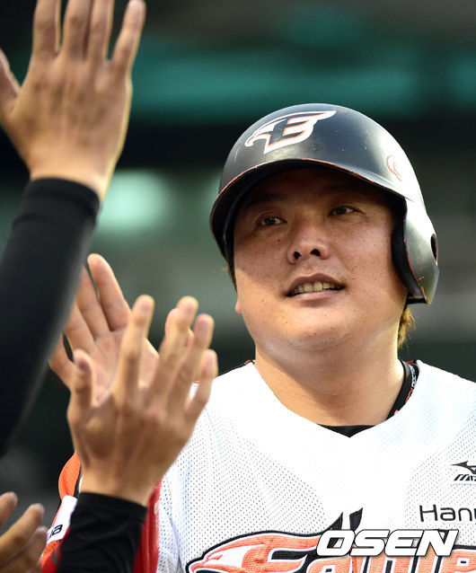 27일 대전야구장에서 벌어진 '2014 한국 야쿠르트세븐 프로야구' 한화 이글스와 NC 다이노스의 경기,2회말 무사 1,2루 김태완의 안타때 홈을 밟은 김태균이 동료들의 환영을 받고 있다.
