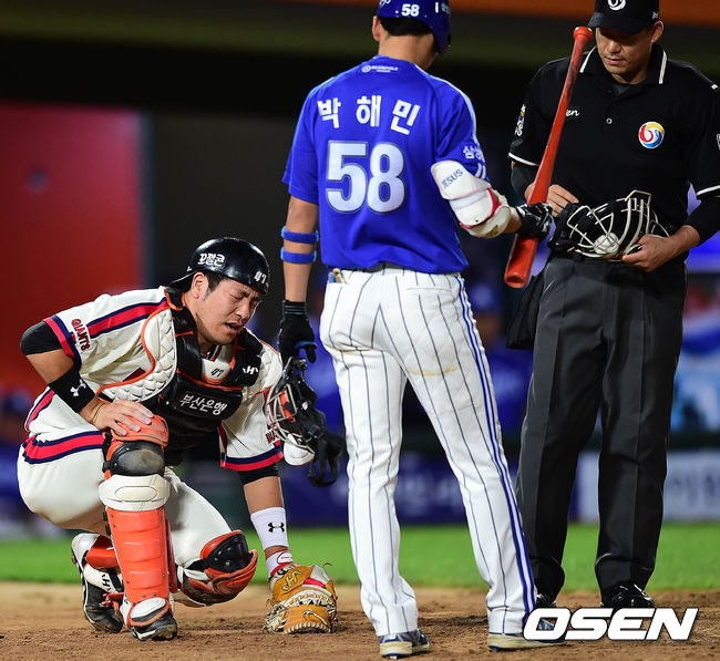 3회초 삼성 공격 2사 1, 2루 상황 박해민의 파울 타구에 맞은 롯데 포수 강민호가 괴로운 표정을 짓고 있다.