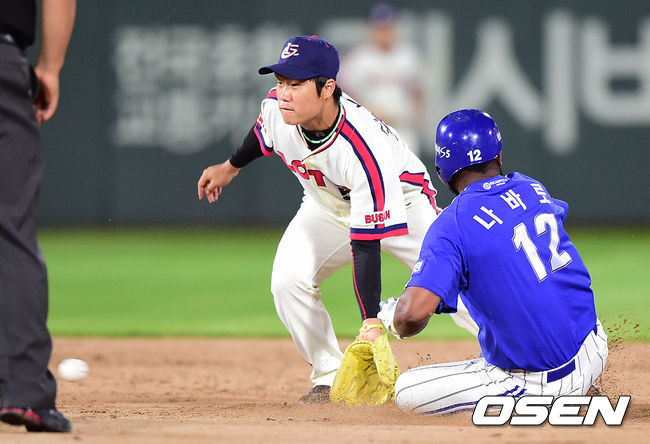 4회초 삼성 공격 2사 1루 상황 박한이 타석 때 나바로가 2루 도루에 성공하고 있다.