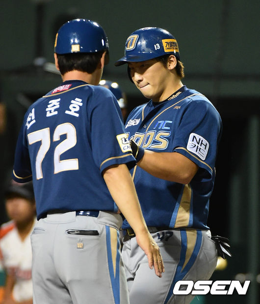 27일 대전야구장에서 벌어진 '2014 한국 야쿠르트세븐 프로야구' 한화 이글스와 NC 다이노스의 경기,4회초 나성범이 솔로홈런을 치고 전준호 코치의 환영을 받고 있다.