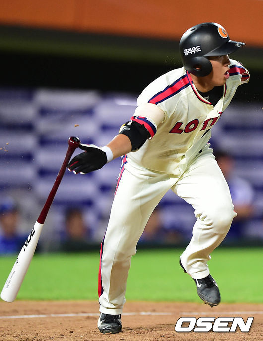 4회말 롯데 공격 2사 1, 2루 상황 하준호가 추격의 1타점 적시 중전안타를 날리고 있다.