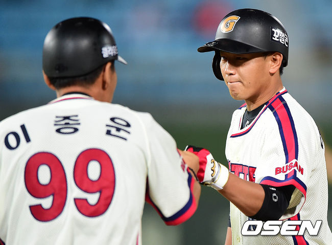 4회말 롯데 공격 2사 1, 2루 상황 하준호가 추격의 1타점 적시 중전안타를 날리고 1루에 안착해 이종운 코치와 인사를 나누고 있다.