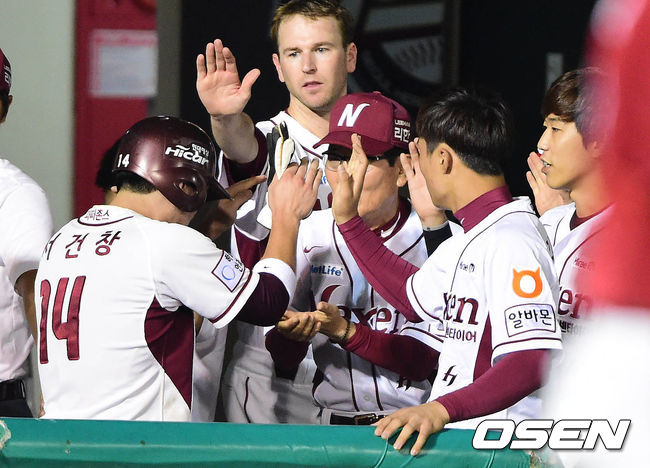 27일 오후 서울 목동구장에서 열린 '2014 한국야쿠르트 세븐 프로야구' 넥센 히어로즈와 KIA 타이거즈의 경기 5회말 무사 2루 이택근의 1타점 적시타에 득점한 2루주자 서건창이 덕아웃에서 동료들과 하이파이브를 하고 있다.