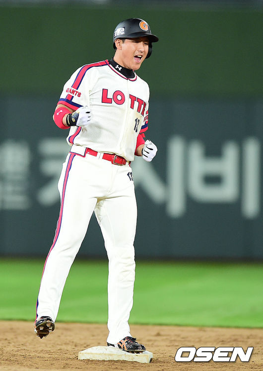 4회말 롯데 공격 2사 1, 3루 상황 황재균이 역전 2타점 좌중간 2루타를 날리고 2루에 안착해 주먹을 불끈쥐며 환호하고 있다.