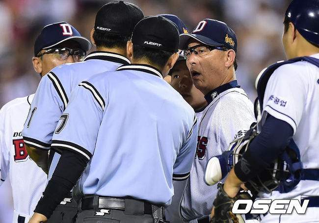 27일 오후 서울 잠실야구장에서 열린 '2014 한국야쿠르트 세븐 프로야구' 두산 베어스와 LG 트윈스의 경기, 4회초 2사 만루 LG 이진영 타석때 두산 정대현의 보크 판정으로 두산 송일수 감독이 판정에 항의하고 있다.