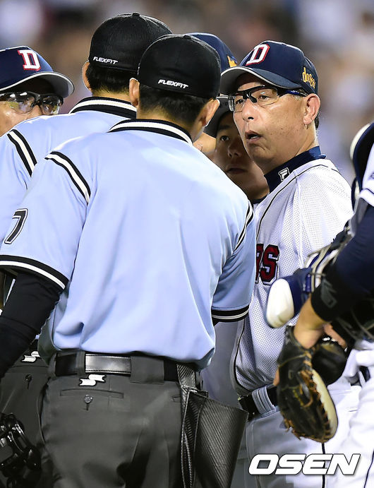 27일 오후 서울 잠실야구장에서 열린 '2014 한국야쿠르트 세븐 프로야구' 두산 베어스와 LG 트윈스의 경기, 4회초 2사 만루 LG 이진영 타석때 두산 정대현의 보크 판정으로 두산 송일수 감독이 판정에 항의하고 있다.