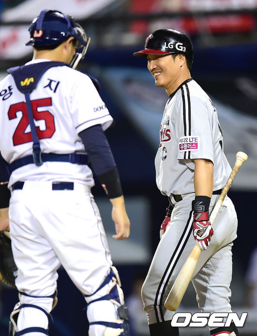 27일 오후 서울 잠실야구장에서 열린 '2014 한국야쿠르트 세븐 프로야구' 두산 베어스와 LG 트윈스의 경기, 4회초 2사 만루 LG 이진영이 구심의 스트라이크 판정에 미소를 짓고 있다.