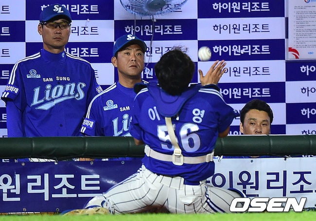 5회말 롯데 공격 1사 주자없는 상황 박종윤의 파울 타구를 이지영이 삼성 더그아웃 바로 앞에서 멋지게 잡아내고 있다.