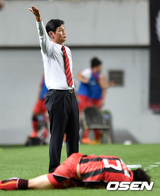 후반 서울 이웅희가 포항과 충돌로 넘어져있자 최용수 감독이 강하게 어필하고 있다.