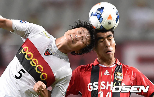 후반 포항 김태수와 서울 박희수가 공중볼 다툼을 하고 있다.