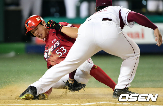 27일 오후 서울 목동구장에서 열린 '2014 한국야쿠르트 세븐 프로야구' 넥센 히어로즈와 KIA 타이거즈의 경기 7회초 2사 1,2루 박기남 타석, 폭투에 홈까지 쇄도하던 2루대주자 이대형이 홈에서 태그아웃 당하고 있다.