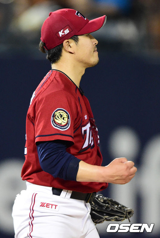 27일 오후 서울 목동구장에서 열린 '2014 한국야쿠르트 세븐 프로야구' 넥센 히어로즈와 KIA 타이거즈의 경기 7회말 2사 1루 박병호를 삼진으로 처리한 김병현이 기뻐하고 있다.