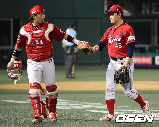 27일 오후 서울 목동구장에서 열린 '2014 한국야쿠르트 세븐 프로야구' 넥센 히어로즈와 KIA 타이거즈의 경기 7회말 2사 1루 박병호를 삼진으로 처리한 김병현이 덕아웃으로 향하며 이성우와 하이파이브를 하고 있다.