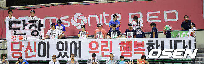 27일 오후 서울 잠실야구장에서 열린 '2014 한국야쿠르트 세븐 프로야구' 두산 베어스와 LG 트윈스의 경기, 두산 팬들이 김태룡 단장과 송일수 감독의 퇴진을 바라는 플랜카드를 들고 경기를 관전하고 있다.