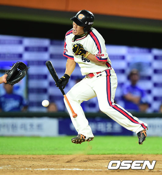 8회말 롯데 공격 무사 1루 상황 신본기가 번트를 시도하다 삼성 투수 김건한의 공에 몸을 맞으며 펄쩍 뛰어오르고 있다.