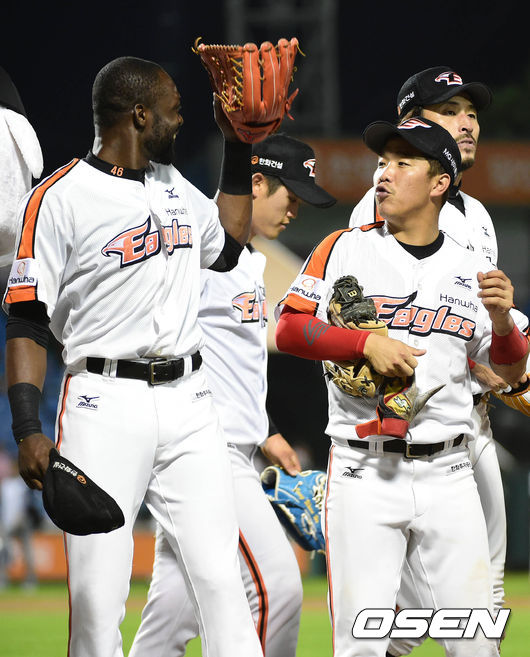 3연승을 거둔 한화 선수들이 마운드에 모여 승리의 기쁨을 나누고 있다./spjj@osen.co.kr