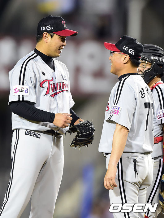 이야기 나누는 류제국-강상수 코치,'오늘 최고의 피칭이야'