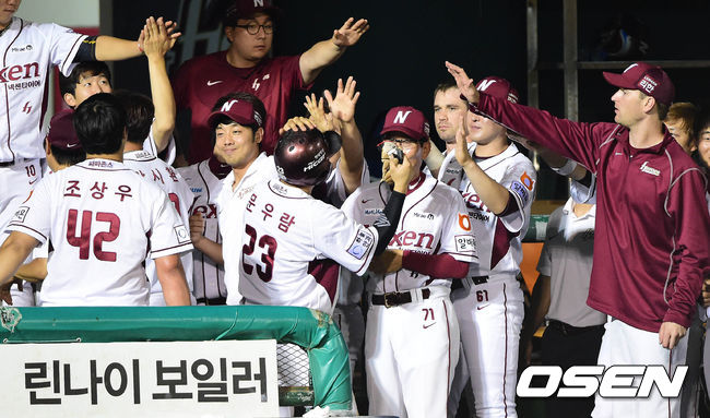27일 오후 서울 목동구장에서 열린 '2014 한국야쿠르트 세븐 프로야구' 넥센 히어로즈와 KIA 타이거즈의 경기 8회말 2사 2루 박동원의 1타점 3루타에 득점한 문우람이 덕아웃에서 동료들과 하이파이브를 하고 있다.