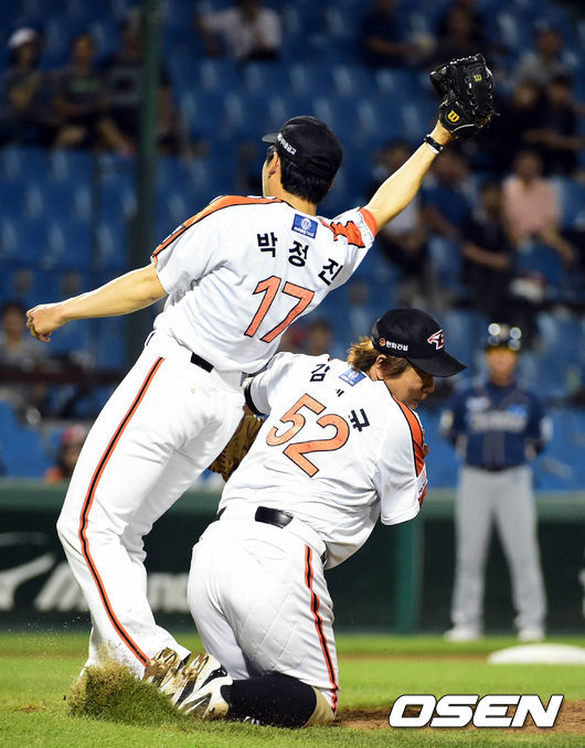 9회초 1사 김성욱의 내야플라이를 박정진과 김태균이 충돌하며 잡고 있다./spjj@osen.co.kr