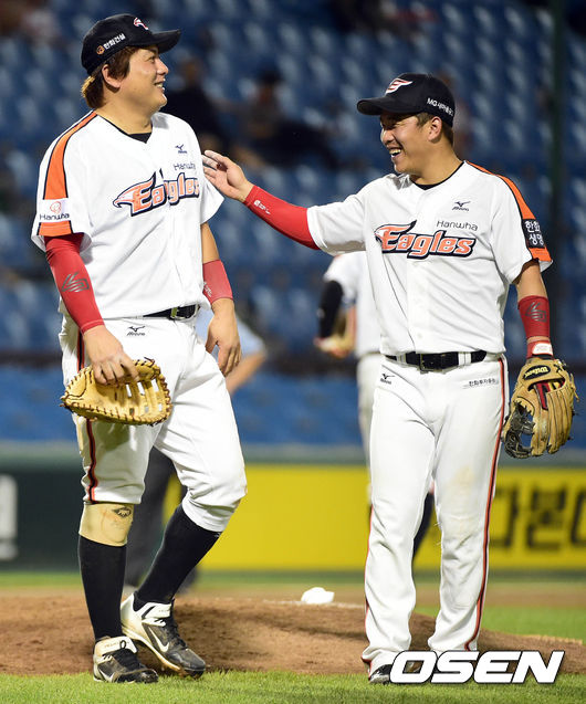 9회초 1사 김성욱의 내야플라이를 수비하다 박정진 투수와 충돌한 김태균을 정근우가 위로하고 있다./spjj@osen.co.kr
