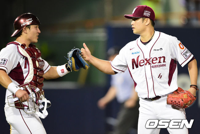 27일 오후 서울 목동구장에서 열린 '2014 한국야쿠르트 세븐 프로야구' 넥센 히어로즈와 KIA 타이거즈의 경기 종료 후 박동원과 손승락이 하이파이브를 하고 있다.