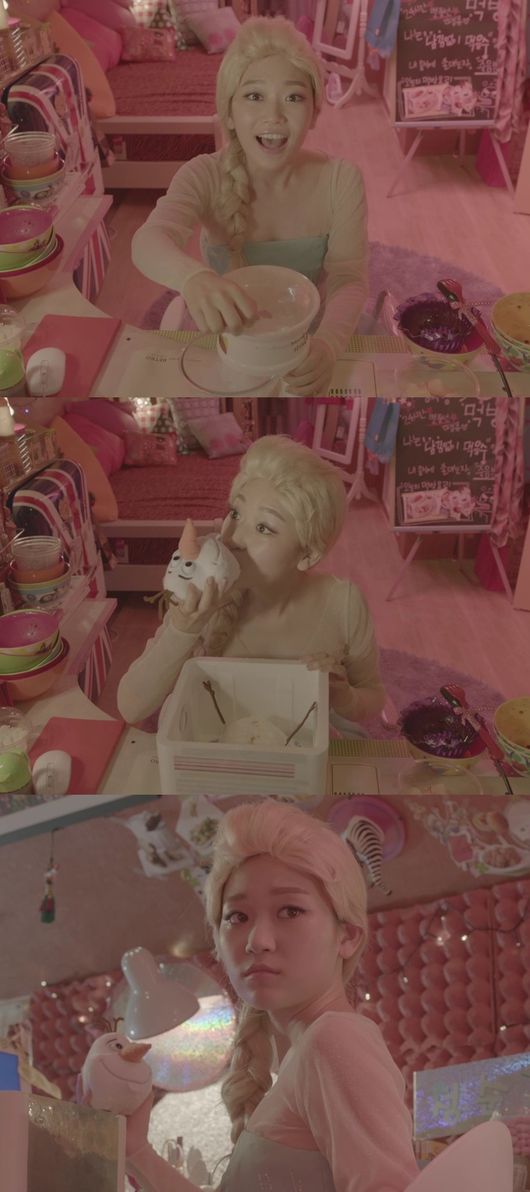 방송을 앞두고 tvN이 공개한 사진 속에는 '겨울왕국' 엘사의 땋은 금발 머리와 하늘빛 의상을 완벽 재현한 김슬기의 모습이 눈길을 끈다. 해맑은 표정으로 빙수 얼음을 만들며 '먹방'에 한창인 모습. 특히 올라프 얼굴 모양의 아이스크림 케이크를 거침없이 집어 먹는 달콤 살벌한 모습이 폭소를 유발하고 있다.