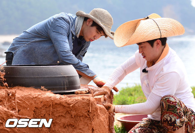 정겨운과 장동민이 흙토 아궁이를 만들고 있다.