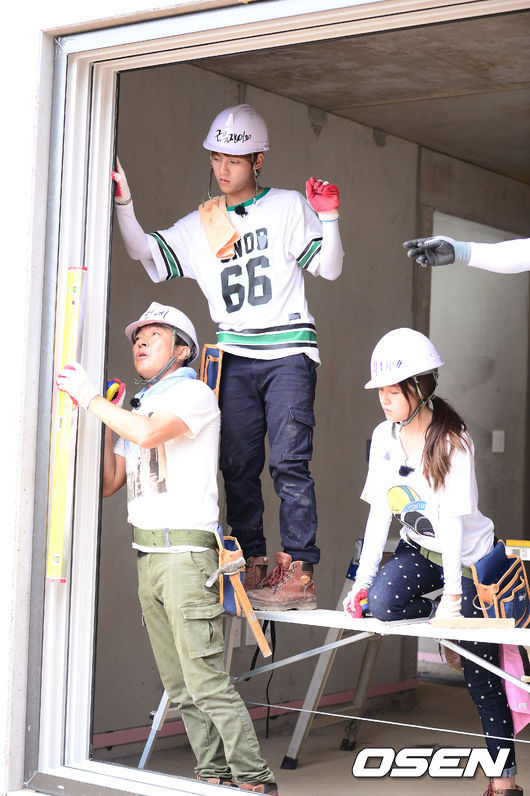 이재룡이 수직 수평을 맞춰가며 집을 짓고 있다.