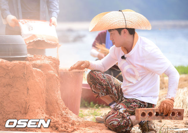 장동민이 황토 아궁이를 만들고 있다.