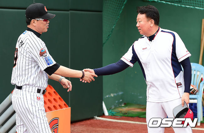 28일 오후 부산 사직구장에서 열리는 '2014 한국야쿠르트 세븐 프로야구' 롯데 자이언츠와 KIA 타이거즈의 경기를 앞두고, 롯데 김시진 감독과 KIA 선동렬 감독이 인사를 나누고 있다.