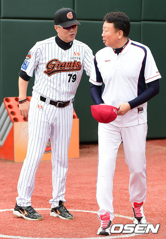 28일 오후 부산 사직구장에서 열리는 '2014 한국야쿠르트 세븐 프로야구' 롯데 자이언츠와 KIA 타이거즈의 경기를 앞두고, 롯데 김시진 감독과 KIA 선동렬 감독이 인사를 나누고 있다.