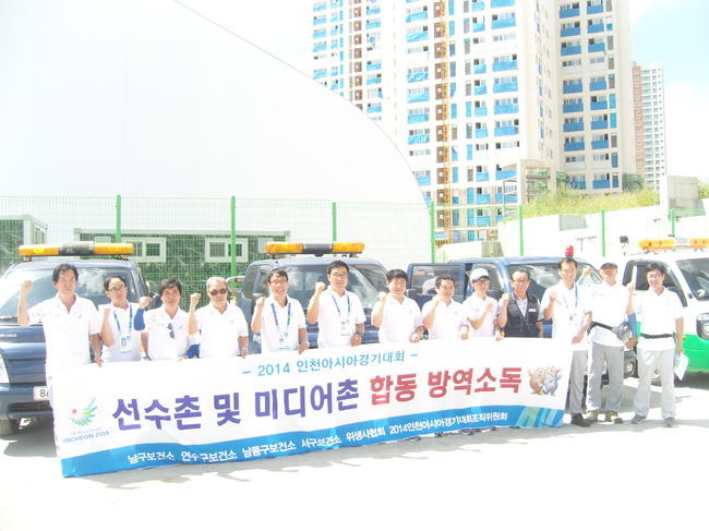 2014인천아시아경기대회 조직위원회(위원장 김영수)는 28일 선수촌과 미디어촌에 대해 보건소 및 위생사협회의 지원으로 합동 방역소독을 실시했다.