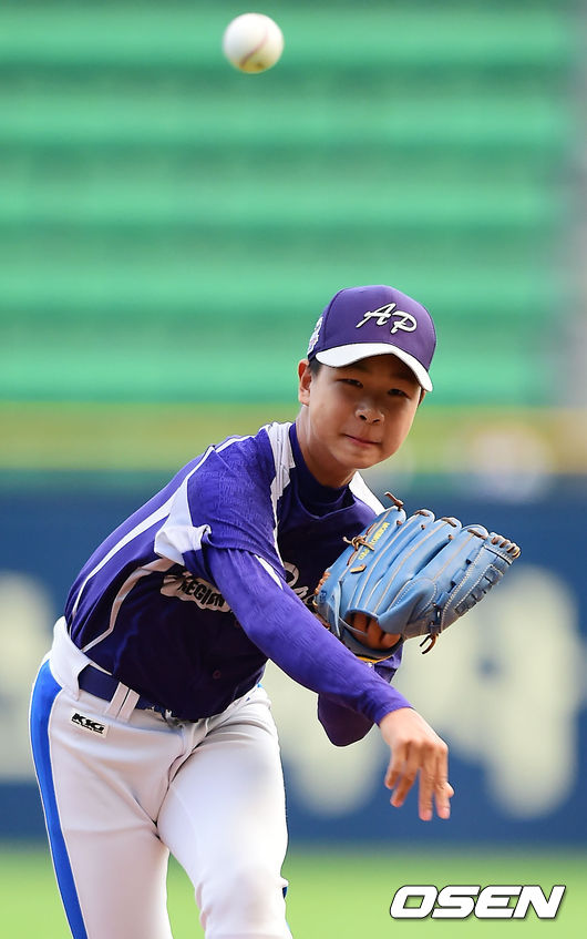 28일 오후 서울 잠실야구장에서 열린 '2014 한국야쿠르트 세븐 프로야구' 두산 베어스와 삼성 라이온즈의 경기, 2014 세계리틀야구 월드시리즈 우승의 주역 송파리틀야구단의 유준하(배재중 1학년)군이 프로야구 시구를 하고 있다.