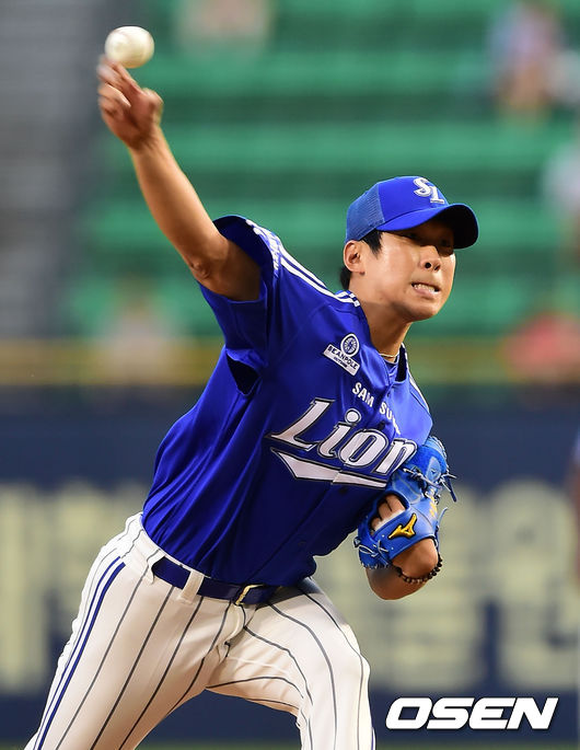 28일 오후 서울 잠실야구장에서 열린 '2014 한국야쿠르트 세븐 프로야구' 두산 베어스와 삼성 라이온즈의 경기, 삼성 선발 윤성환이 힘차게 공을 뿌리고 있다.