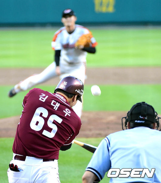 28일 대전야구장에서 벌어진 '2014 한국 야쿠르트세븐 프로야구' 한화 이글스와 넥센 히어로즈의 경기,강정호가 유니폼을 미쳐 챙기지 못해 김대우 투수의 유니폼을 빌려입고 경기에 나서고 있다.