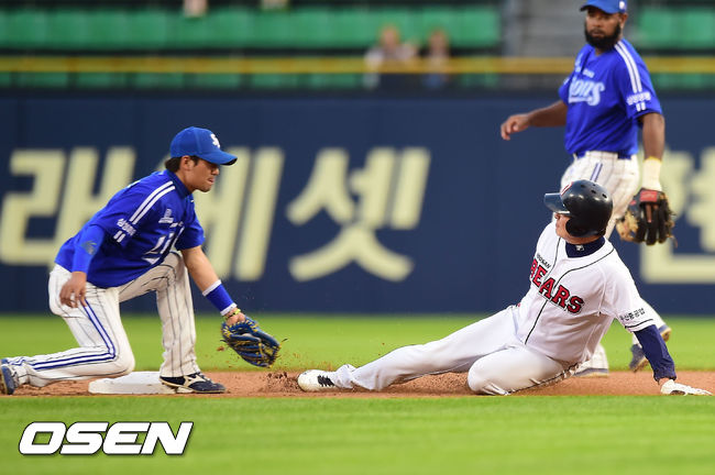 28일 오후 서울 잠실야구장에서 열린 '2014 한국야쿠르트 세븐 프로야구' 두산 베어스와 삼성 라이온즈의 경기, 1회말 무사 주자 1루 두산 정수빈이 타석에서 삼진아웃을 당할때 1루 주자 민병헌이 2루 도루에 성공하고 있다.
