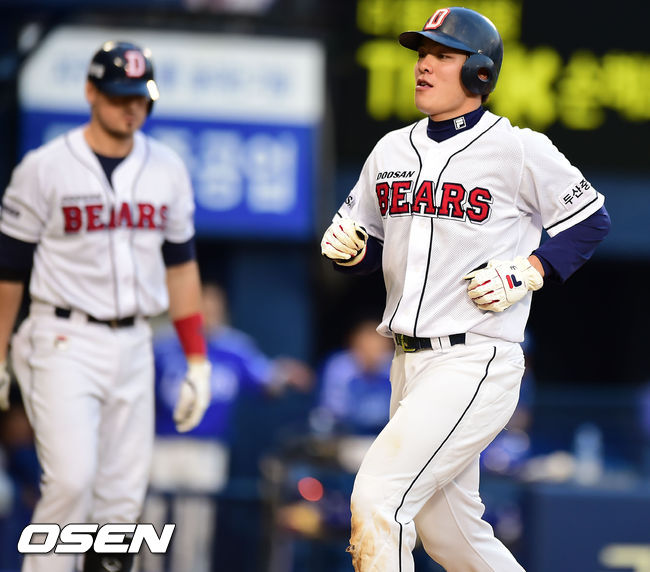 28일 오후 서울 잠실야구장에서 열린 '2014 한국야쿠르트 세븐 프로야구' 두산 베어스와 삼성 라이온즈의 경기, 1회말 2사 주자 3루 두산 칸투 타석에서 삼성 선발 윤성환의 와일드피칭때 3루 주자 민병헌이 홈을 밟고 있다.