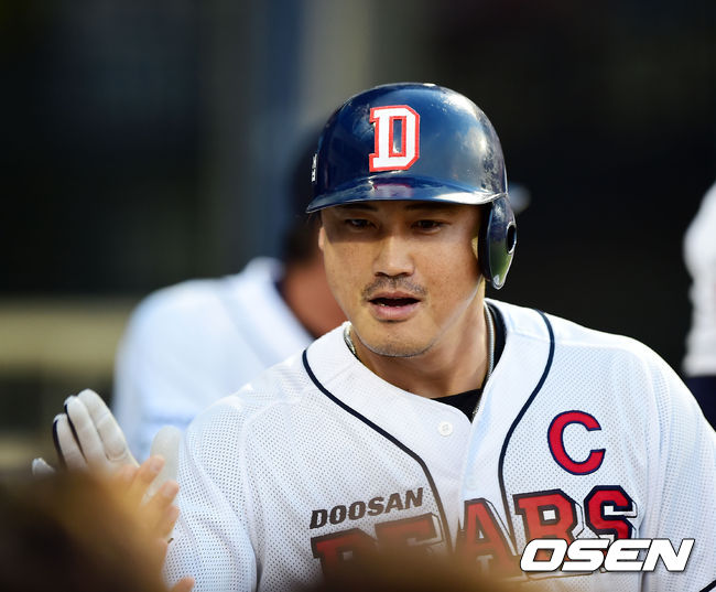 28일 오후 서울 잠실야구장에서 열린 '2014 한국야쿠르트 세븐 프로야구' 두산 베어스와 삼성 라이온즈의 경기, 1회말 2사 주자 1루 두산 홍성흔이 좌중월 투런 홈런을 날린 후 덕아웃에서 동료들과 하이파이브를 하고 있다.
