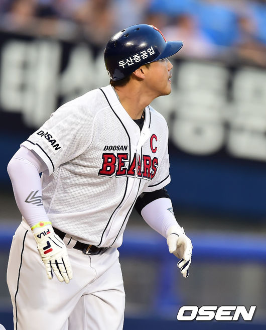 28일 오후 서울 잠실야구장에서 열린 '2014 한국야쿠르트 세븐 프로야구' 두산 베어스와 삼성 라이온즈의 경기, 1회말 2사 주자 1루 두산 홍성흔이 좌중월 투런 홈런을 날리며 타구를 바라보고 있다.