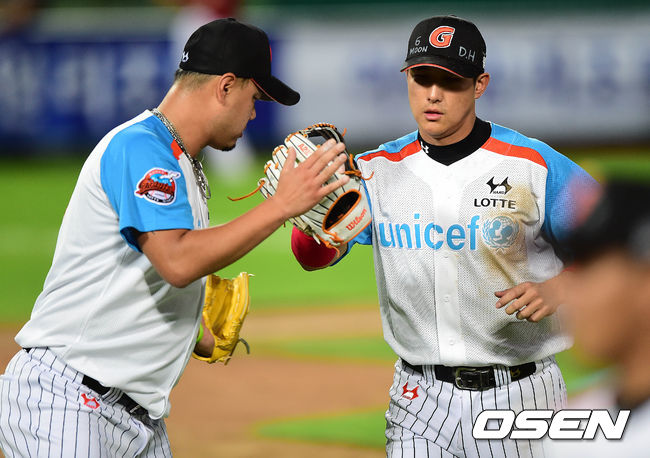 2회초 KIA 공격 1사 3루 상황 김민우의 직선타를 잡아낸 롯데 3루수 황재균이 3루 주자 신종길 마저 포스아웃 시키며 더블플레이를 이끌어내 실점없이 이닝을 마무리 지었다. 더그아웃으로 들어오며 인사를 나누는 롯데 선발 송승준과 3루수 황재균.