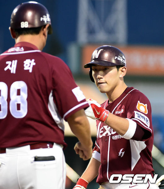 28일 대전야구장에서 벌어진 '2014 한국 야쿠르트세븐 프로야구' 한화 이글스와 넥센 히어로즈의 경기,2회초 1사 2,3루 서건창이 2타점 적시타를 치고 심재학 코치와 하이파이브를 하고 있다.