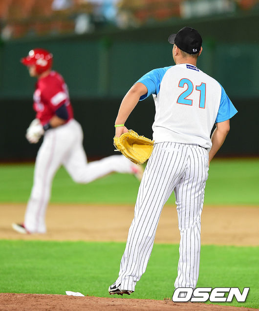 3회초 KIA 공격 1사 3루 상황 필에게 선제 중월 투런포를 허용한 롯데 선발 송승준이 그라운드를 바라보고 있다.