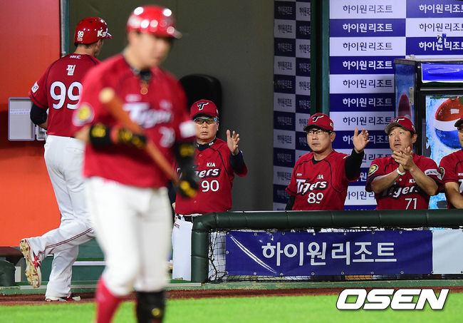 3회초 KIA 공격 1사 3루 상황 필이 선제 중월 투런포를 날리고 홈을 밟은 뒤 선동렬 감독과 인사를 나누고 있다.